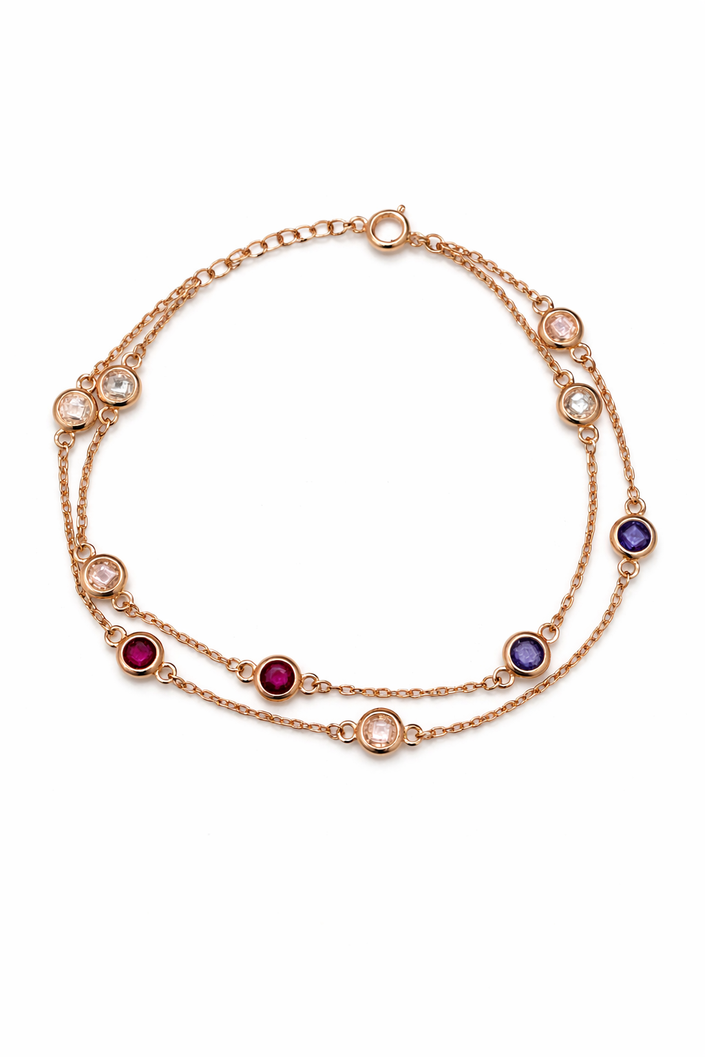 Design: Dual Chain Bracelet Adorned with Multi-Colored Bezel-Set Stones for a Vibrant Yet Elegant Look