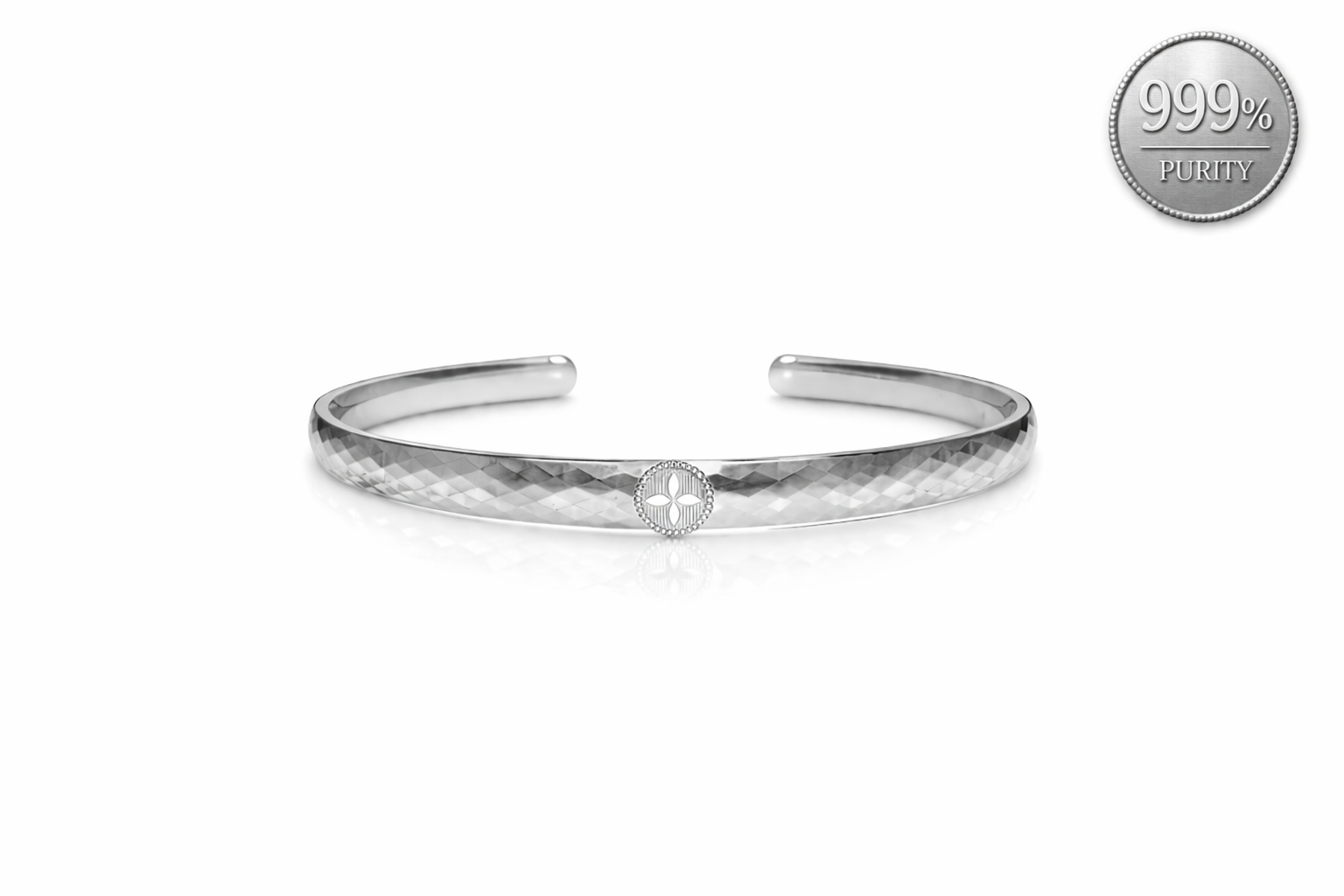 Design: Minimal Circular Emblem with Full surface Diamond-Cut Faceting For a Rich Reflective Shine